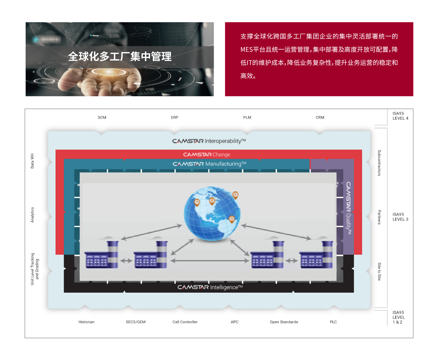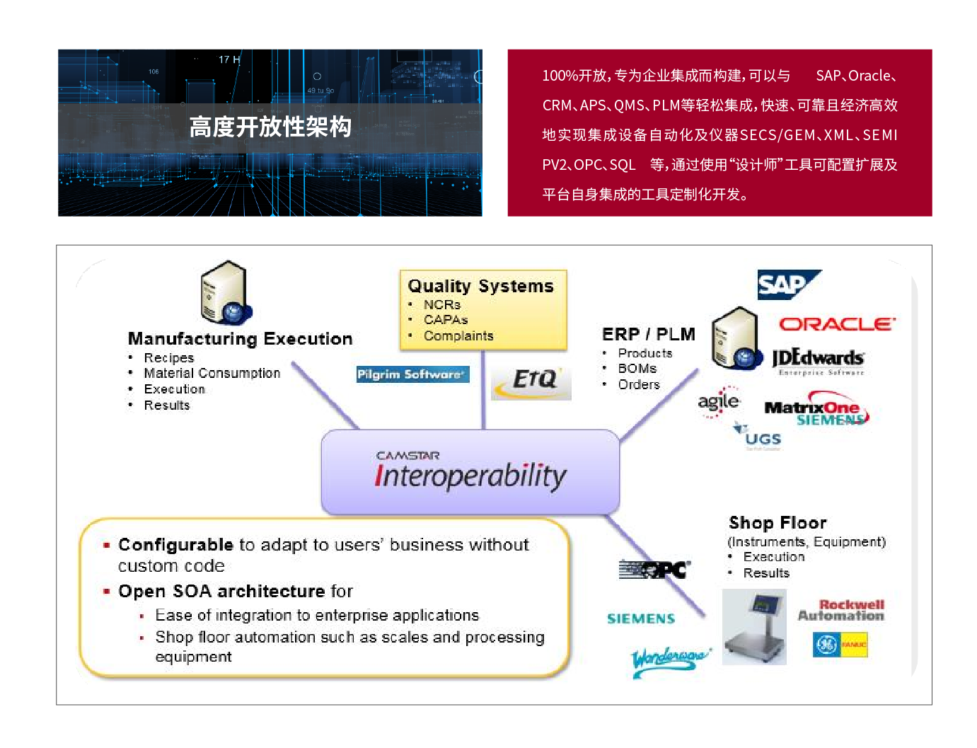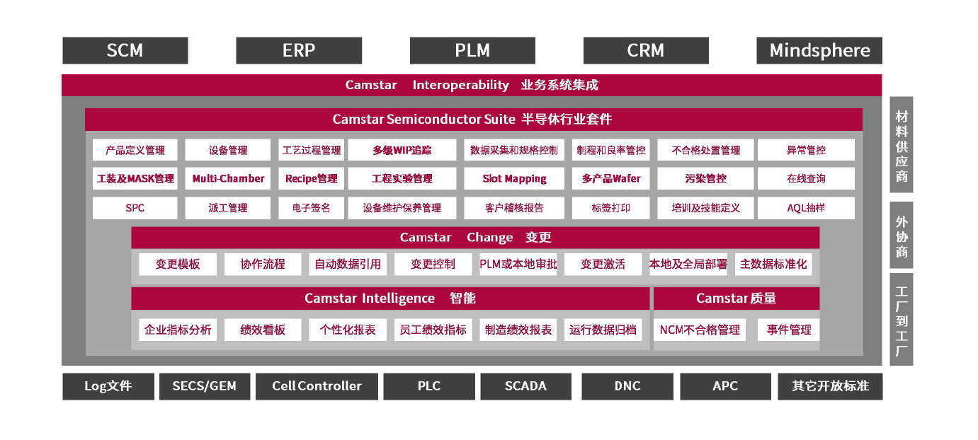 (1)Opcenter Execution Semiconductor(Camstar Semiconductor Suite半导体行业套件)专为前端和后端半导体制造运营而打造,可提供开箱即用的高级行业功能、高级别的可配置性以及与其他业务系统的完全互操作性。它还提供从测试结果和产量到统计质量控制的全方位即时信息,可助您提高质量和生产效率。无需更改即可支持晶圆制造、集成电路以及离散装配和测试操作。它凭借强大的功能可以处理大量事务,而通过灵活性可以满足各个工厂的特定需求。它可以轻松地与企业业务系统和车间进行集成,并且无需大量自定义即可快速进行部署,从而可以通过扩展来应对未来的需求。