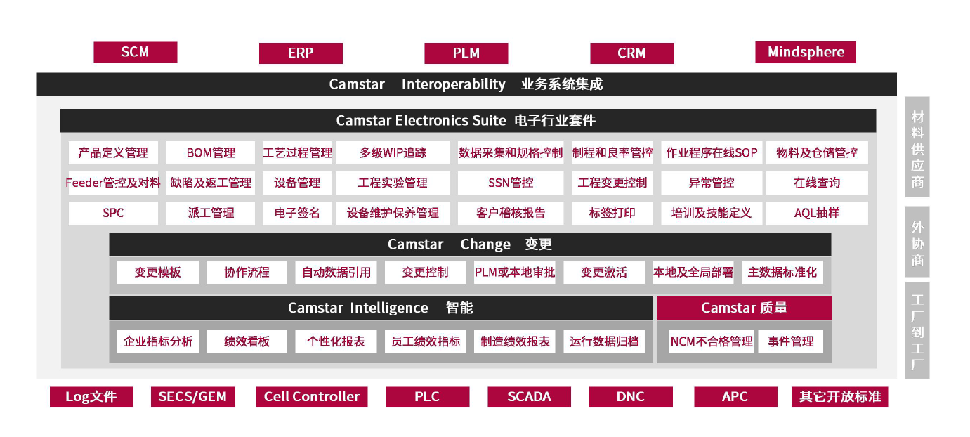 (2)Opcenter Execution Electronics(Camstar Electronics Suite)是面向电子行业的完整数字制造解决方案。它涉及PCB,机械组装和盒装生产。该解决方案基于与机器和生产线的直接连接,包括制造执行,质量管理,计划和调度,物料管理和制造智能。集成了Siemens Digital Industries Software产品组合,并将数字线程从整个设计扩展到了制造流程。电子制造商可以满足不断增长的客户需求和质量来快速更改和重新配置制造和质量流程,实现更快的NPI和上市时间,同时提高他们在迅速变化、消费者驱动的市场中的竞争能力。