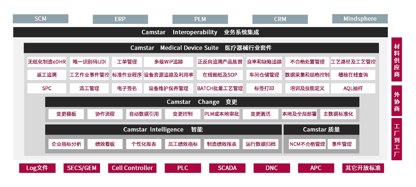 (3)Opcenter Execution Medical Device and Diagnostics (Camstar Medical Device Suite医疗器械行业套件)是医疗设备和诊断行业的领先制造执行解决方案,有助于防止流程出错并且支持无纸化制造、电子设备历史记录 (eDHR) 和电子批次记录 (eBR)。新兴、中等规模和全球性企业都面临既要缩减成本又要确保合规的挑战,同时还需要始终如一地生产出高质量的产品。帮助医疗和诊断设备企业成功应对这些挑战方面拥有成熟的经验。其中纳入医疗设备制造领域的典范做法,能够更快地在企业实施。它可以帮助您加快创新、降低成本,并获得高品质产品,同时确保优秀的制造流程合规。