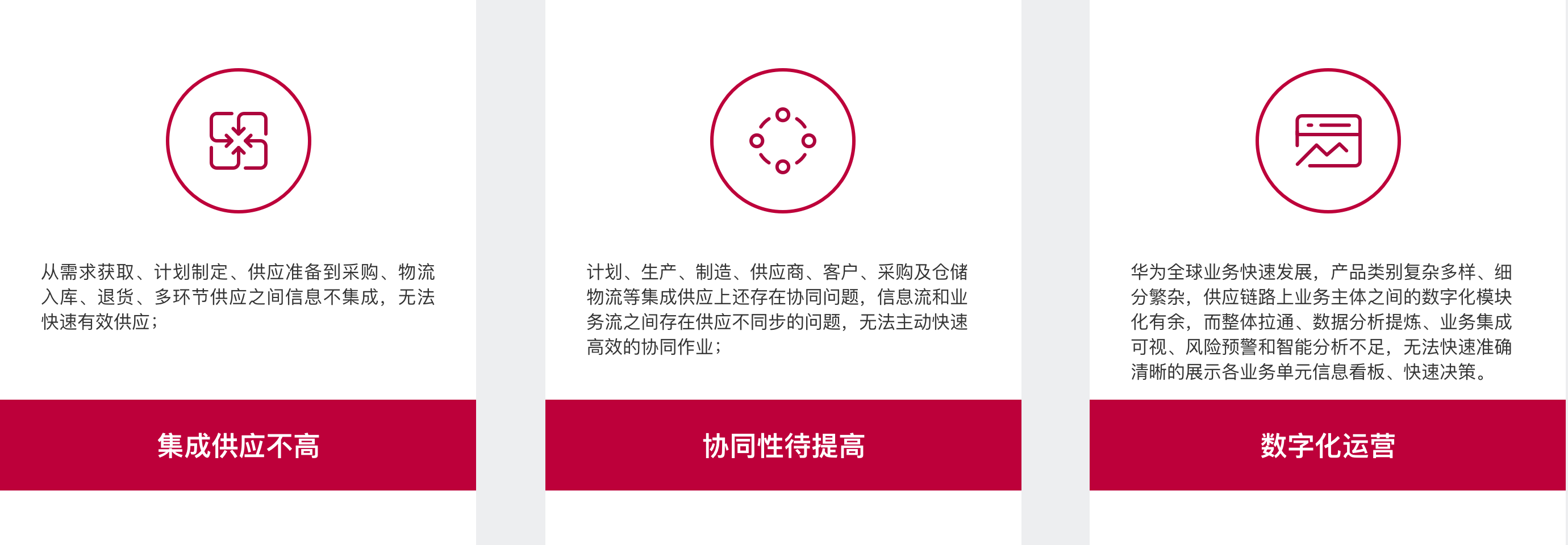 以客户为中心,围绕三条主线(集成供应、生态协同、数字运营)进行数字化转型,实现供应生态的完美协同与客户高满意度,以数据驱动,追求最优成本和最佳供应效率。