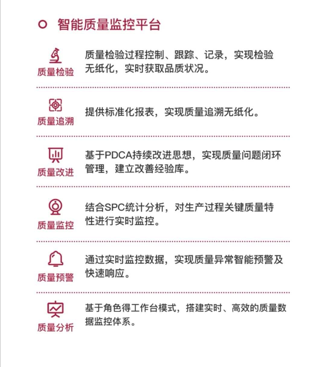 SMOM-QMS产品是赛意信息集成各行业尤其在离散制造业客户的实践与总结,致力于建立一套“PDCA持续改进”的质量管理系统,实现制造过程的质量监控、预警、分析和改进。产品核心模块包括:检验标准管理、来料质量管理、过程质量管理、成品质量管理、PDCA质量改进管理、SPC监控预警,通过各模块实现供应商质量控制、生产过程质量控制、质量分析、实时看板监控等。